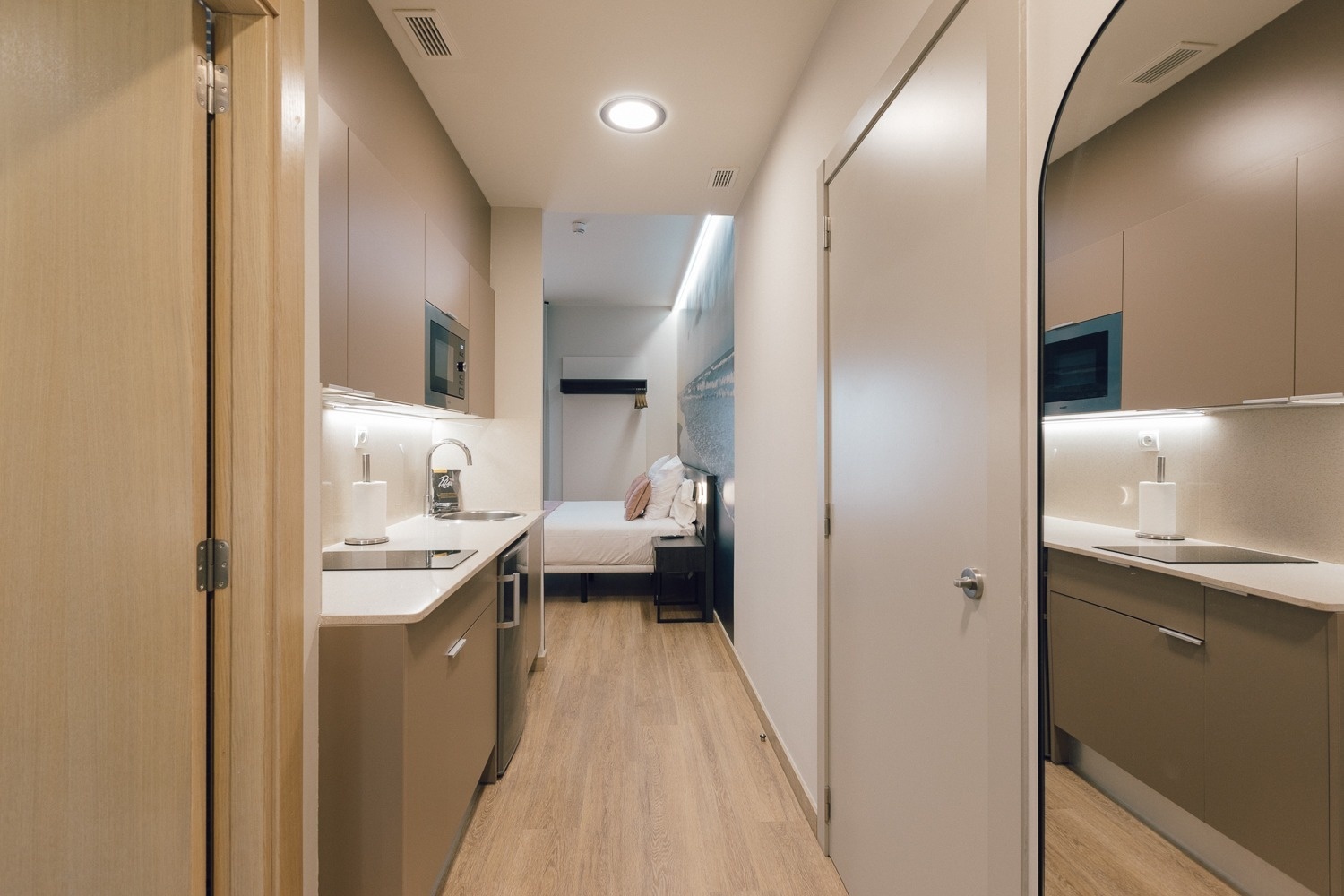 Dos apartamentos de 32-36 m² conectados con una puerta interior. Formados, ambos, por un dormitorio con una cama matrimonial de 1,80 m o 2 camas individuales de 90 cm. Baño privado en cada una de ellas con ducha raindance y cocina americana totalmente equipada.